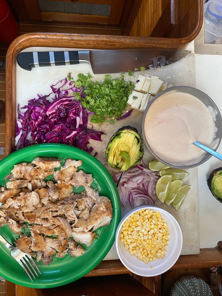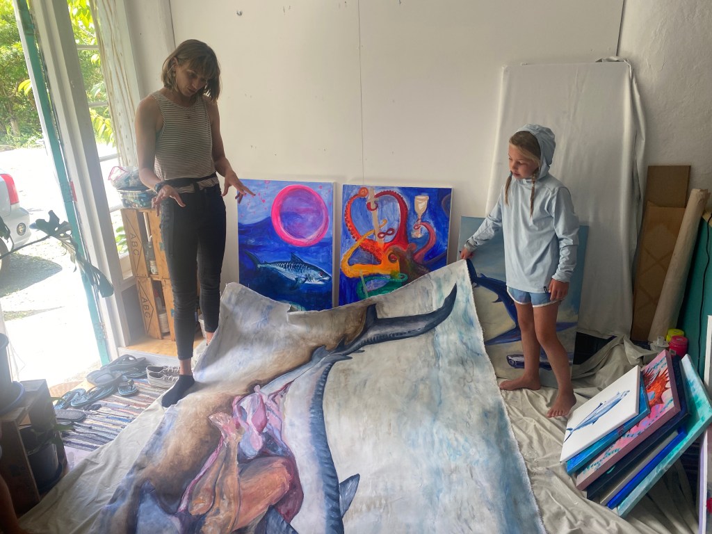 We also do practical boat stuff — like tie bowlines, cleat knots, and clove hitches, and what the parts of the boat are called. I teach Spanish like I do for my job, standing in a small circle (of 4), speaking only in Spanish, interacting and playing games. I find that I am strictest when we are doing Spanish class, because that is what I’m used to doing for my job — and I expect them to know my expectations — stay in the circle! don’t slouch around on the cushions! But I realize that I need to adjust my expectations a little for elementary aged kids…and not get so frustrated when they get off task. I’m learning! We do reading & writing & typing, math and science. For PE we do yoga and swimming/snorkeling/hiking. For art (so far) we visited Taylor in her art studio one day. For music Riki is teaching Jade ukelele.