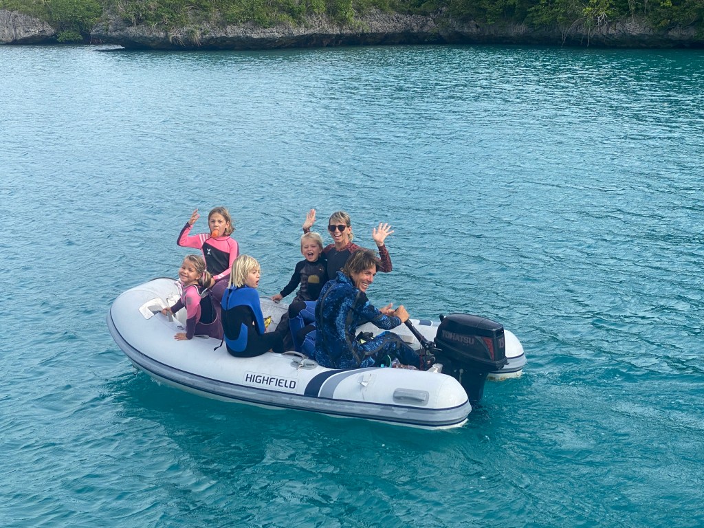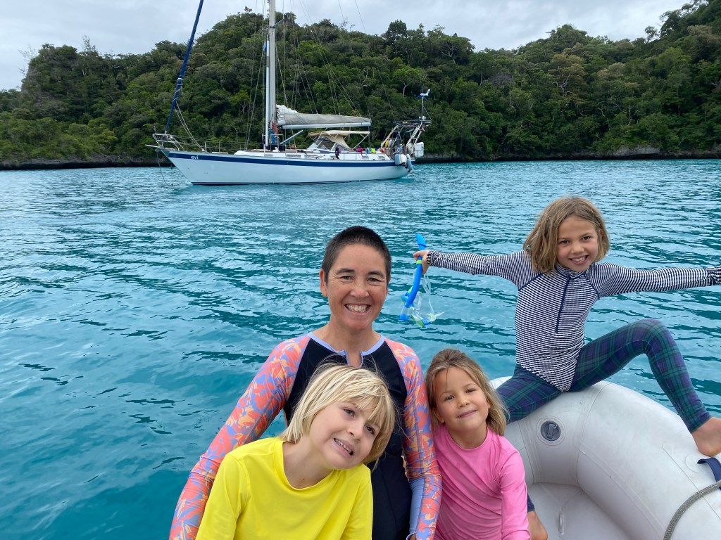 We had a rough sail to Viani Bay — heading upwind in 15-20 knots was bumpy, and we all felt seasick except Riki. In Viani Bay we hung out with our friends Margeaux, Jarrett, Gretchen & Edgar on SV Lion’s Den — the kids spent hours playing in the water on surfboards and the paddleboard. We also did some amazing snorkeling on Rainbow Reef. It was a super long dinghy ride, but we arrived at Rainbow’s End just a slack tide, and enjoyed the marvelous soft corals, hard coral and fish. I also saw a big eel slithering down there, and a big purple jellyfish.