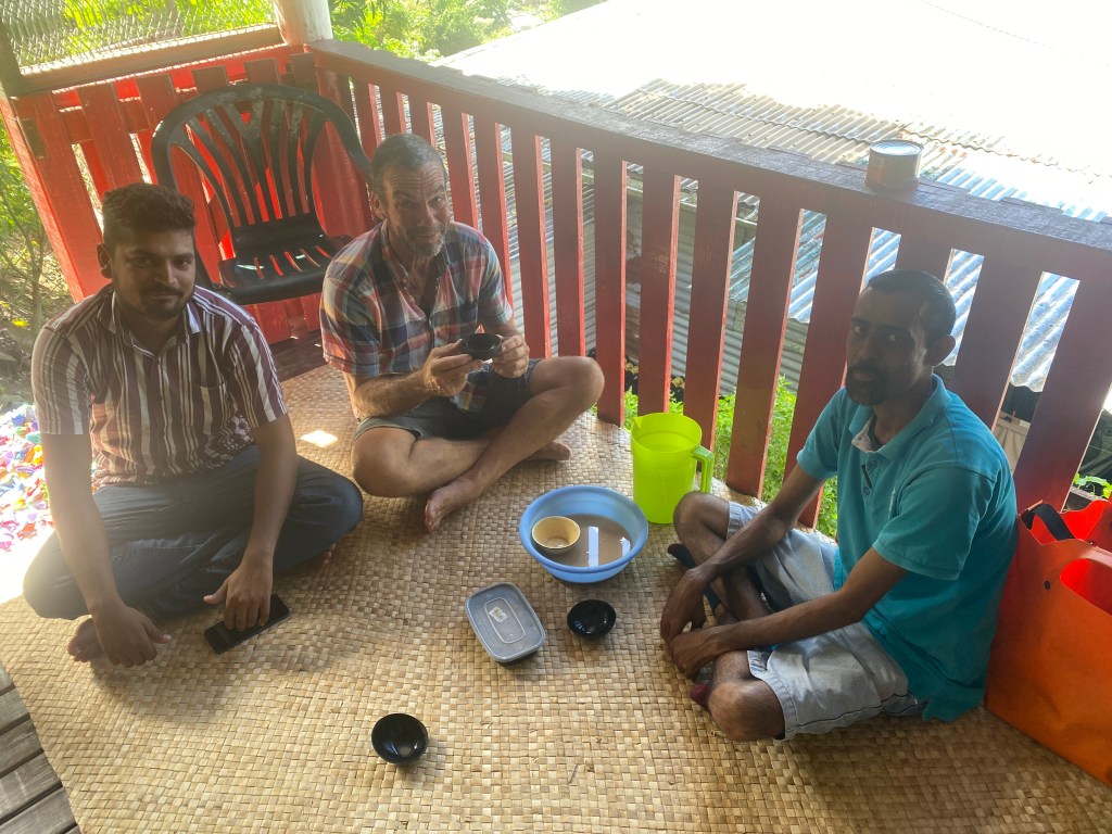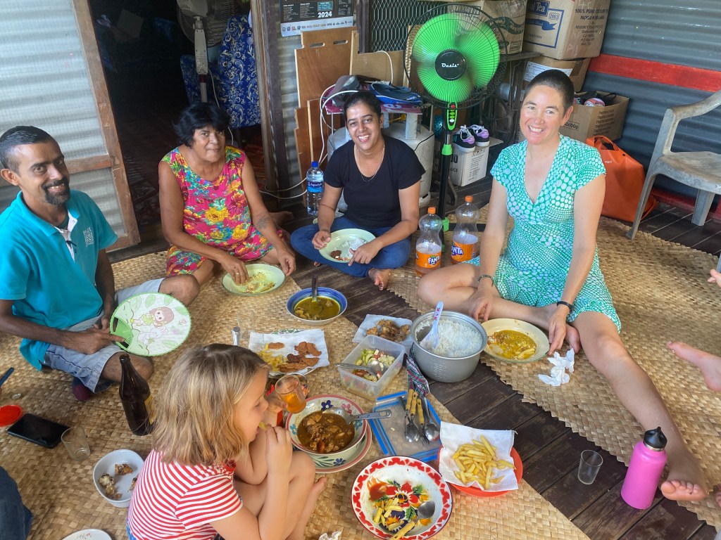 Our friend Anjana had us over to her house one day for lunch. Nine years ago, she was still building her house. Her mom Sushila cooked us a feast: rooster curry, chicken & veggies in soy sauce, chips and chicken nuggets, fried fish, rice, and dhal. We sat on mats on the floor and ate with our hands, as is the custom here. Anjana’s brother Devan brought out the kava, and he & Riki drank lots of beer — “taki”!