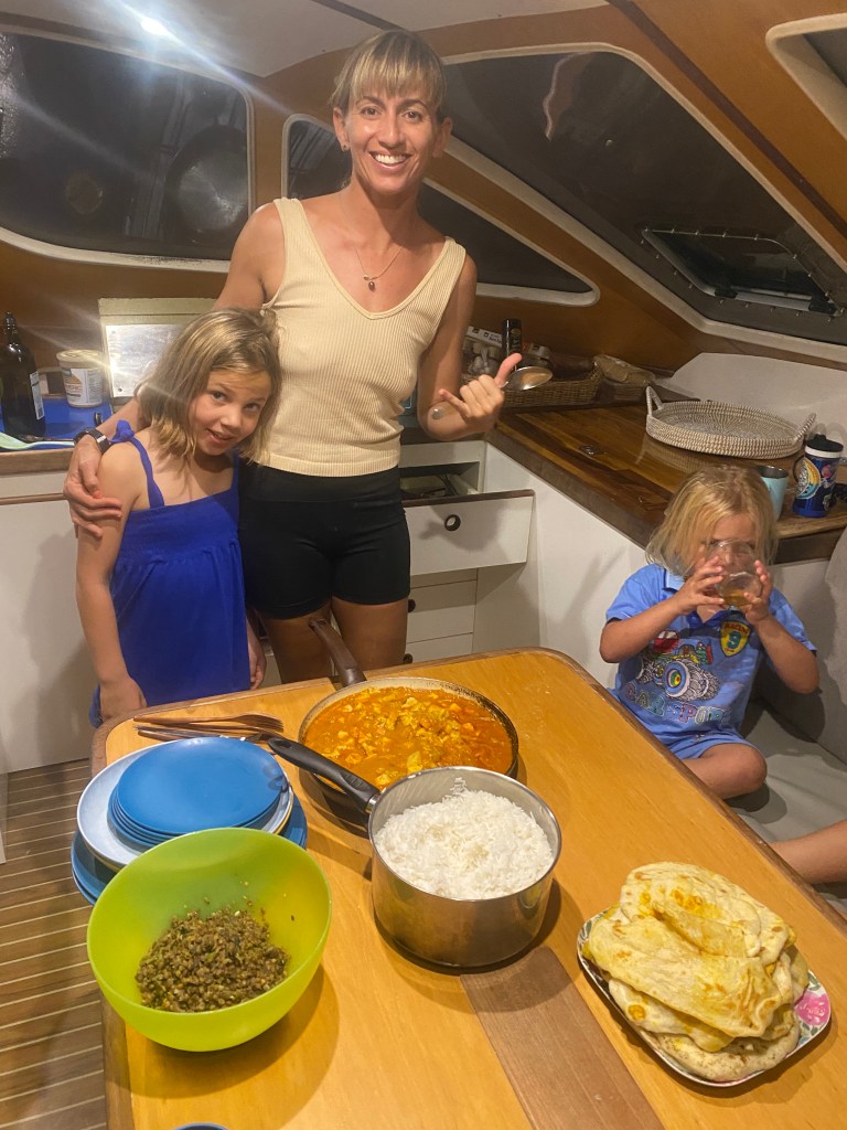 We reunited with our friends on SV Pangea in the Bay of Islands, near Daliconi village. We dropped the hook at 4:45 pm, and Taylor invited us all over for fish tikka masala, dhal, and homemade naan at 6 pm. She’d been feeding 4 people on board, hadn’t provisioned in 2 weeks, and didn’t bat an eye at having 5 more mouths to feed.