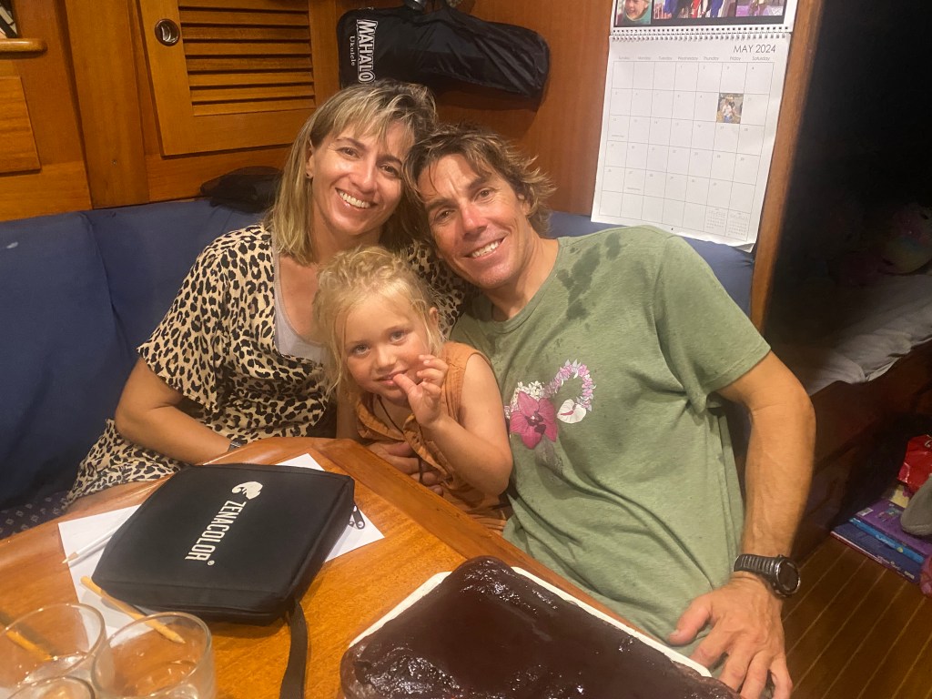 The next day was Brad’s birthday, and SV Pangea crew came to evi for dinner. I made chicken chow mein, and the girls decorated the boat and made Brad cards. During the day the kids did their first swim through with Brad & Taylor. We snorkeled and saw a turtle! and beautiful fan coral, fish, and tons of multi-colored soft coral on a log.