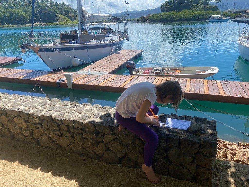 Riki was busy fixing the things that broke on passage — he got the aft head working again, yay! And he found a pinhole in the wet exhaust pipe, so he took it off, took it to a welder for a patch, and installed it again. And washed all the gear in the aft lazarettes, and washed the boat. We started home school again, the highlight being doing a scavenger hunt on land around the Copra Shed Marina to learn about Fiji (a lesson I got from Teachers Pay Teachers).