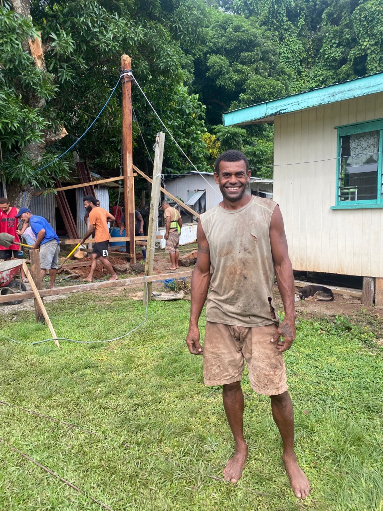 We did an overnight sail to Vanua Balavu, and did the sevusevu ceremony at Daliconi village. The sevusevu ceremony is where the visitor presents the yagona root bundled like a bouquet of flowers, and requests permission from the village chief to swim/snorkel/go ashore. On our visit, the village headman, Tuta, was adding on to his house. Many men were involved in the building, and others were sitting on a porch drinking kava, which is part of the tradition of house-raising.