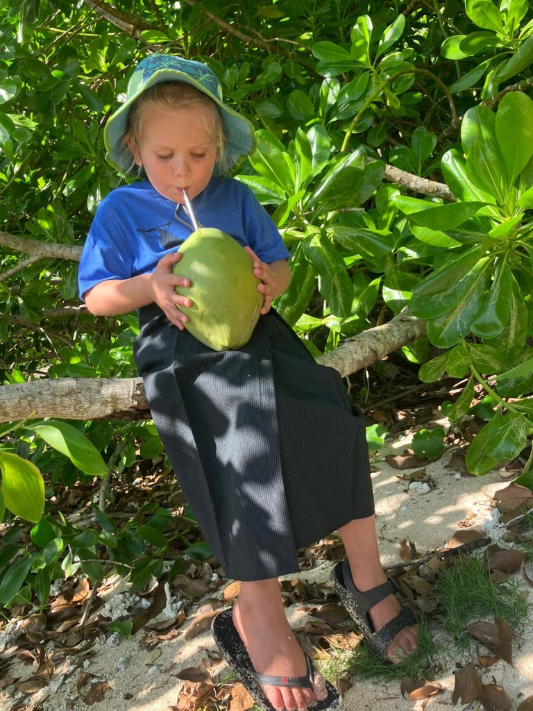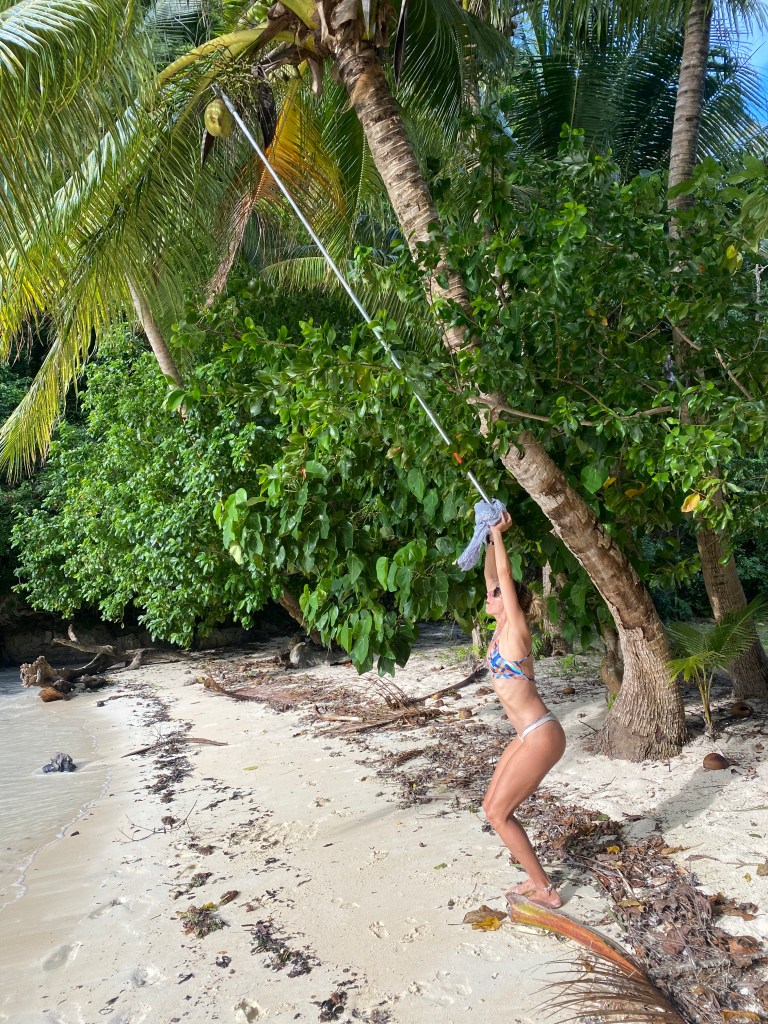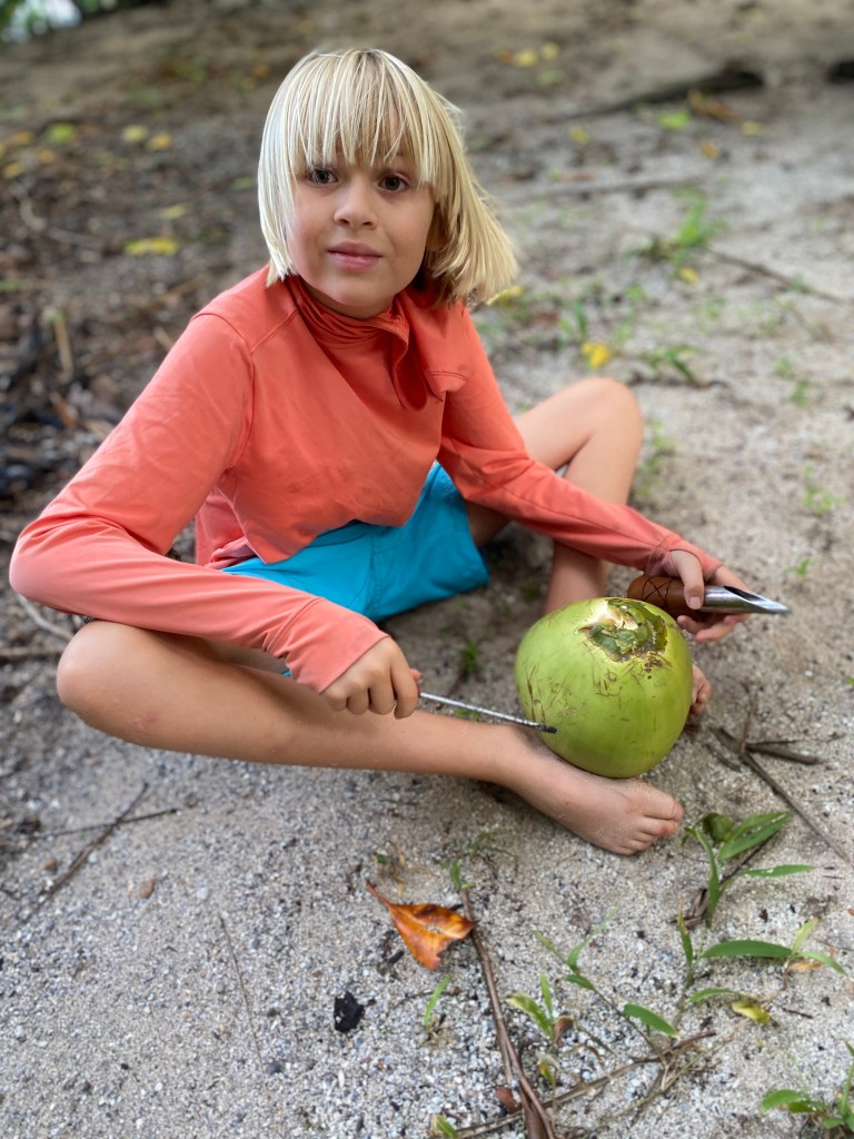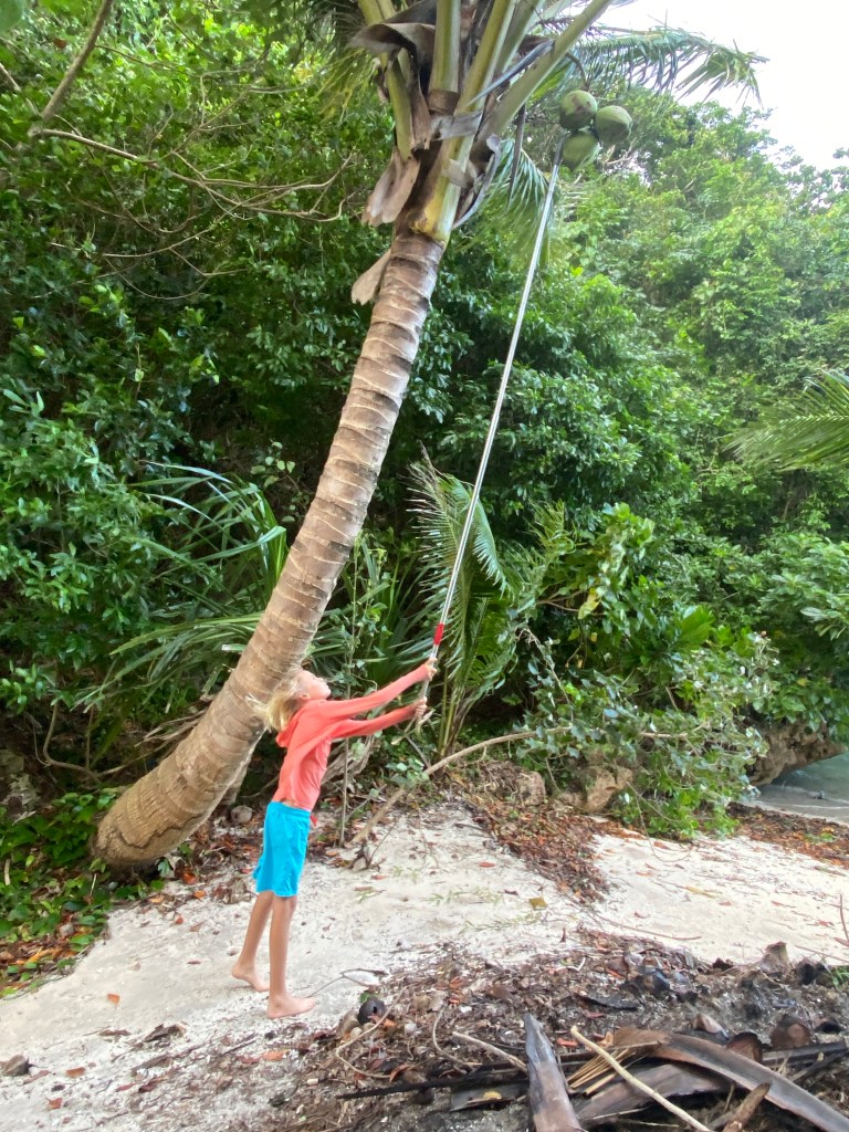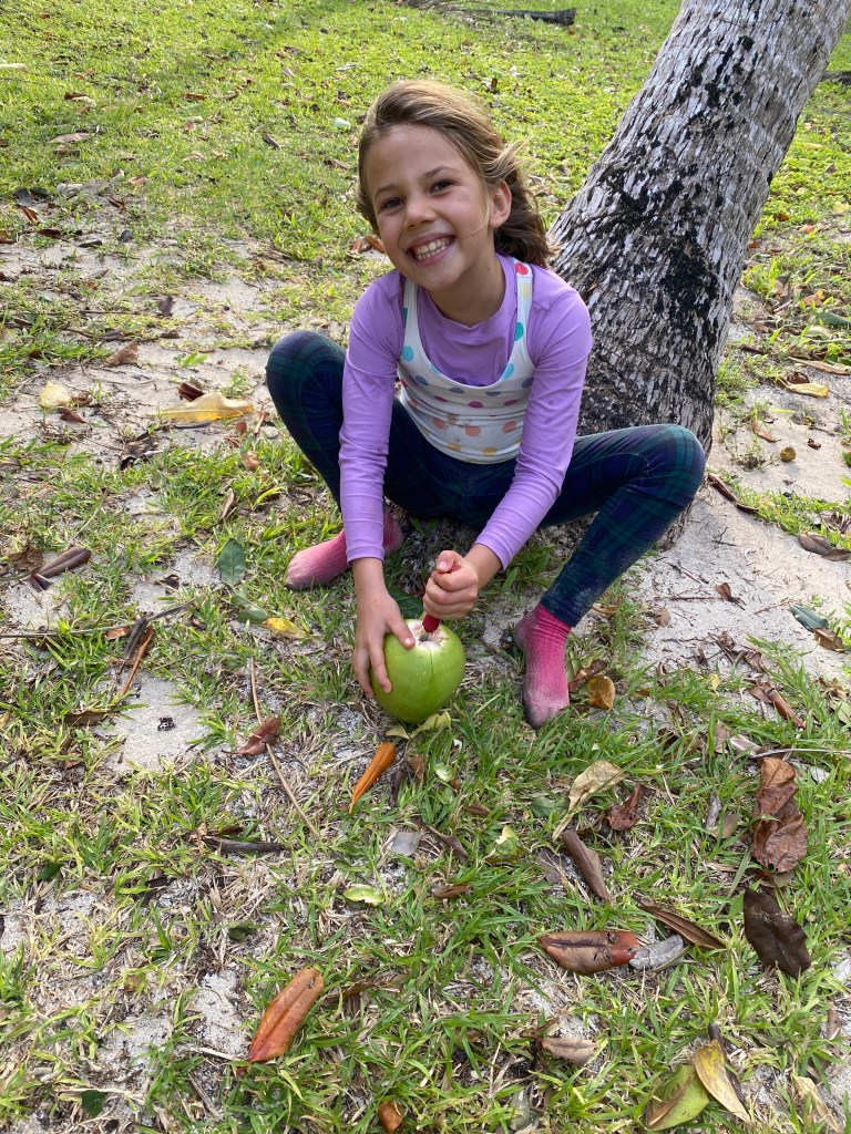 The same day as we provisioned, we went to a beach in the afternoon to go coconut hunting. Taylor has some special tools for opening coconuts, and she taught us how to do it.