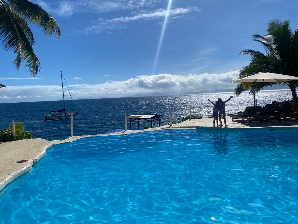 We sailed overnight from Lakeba to Paradise Resort on the south side of Taveuni island. Riki caught a skipjack tuna trolling and gave it to the resort kitchen as a type of sevusevu. We had lunch and the kids had a swim in the pool.
