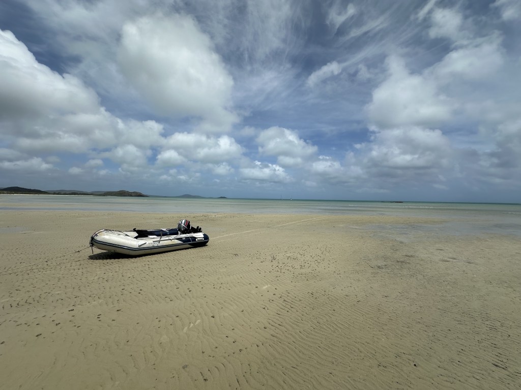 Then we arrived at Cape York, the northernmost point of the Australian continent, or “the tip”. It was hairy getting into the anchorage — we saw 2.7 meters on the depth sounder and we draw 1.88 meters! We saw four wild horses walking on the beach when we arrived.