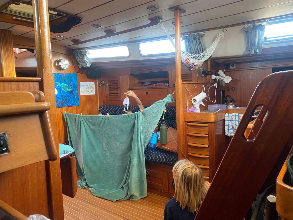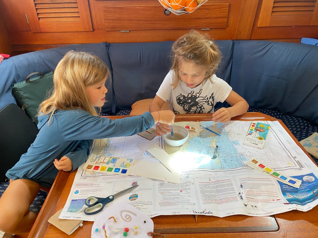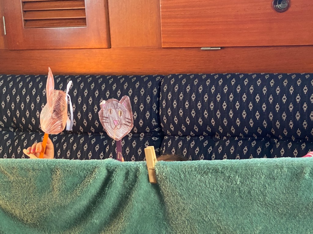 We would usually nap as soon as we got to our destination and put the sail cover and the instrument covers on. We didn’t do any home schooling during this stretch because we were pushing hard to make miles. However, the kids engaged in many creative endeavors. They made a puppet show, complete with soundtrack produced by musical instruments. Jade and Luz invented some song and dance numbers (Jade singing and Luz dancing). All three kids played tons of games: Catan, Ticket to Ride, Nerts, and mah jong. Once I woke up and they were playing mah jong 3-handed, with a dummy. Ha! I’m learning not to stress too much about home schooling. I asked them to try to finish their math textbooks before September and the start of a new school year in the US. They worked super hard to do it, doing maths while underway and at all hours of the day. They did it! I was a proud teacher mama.