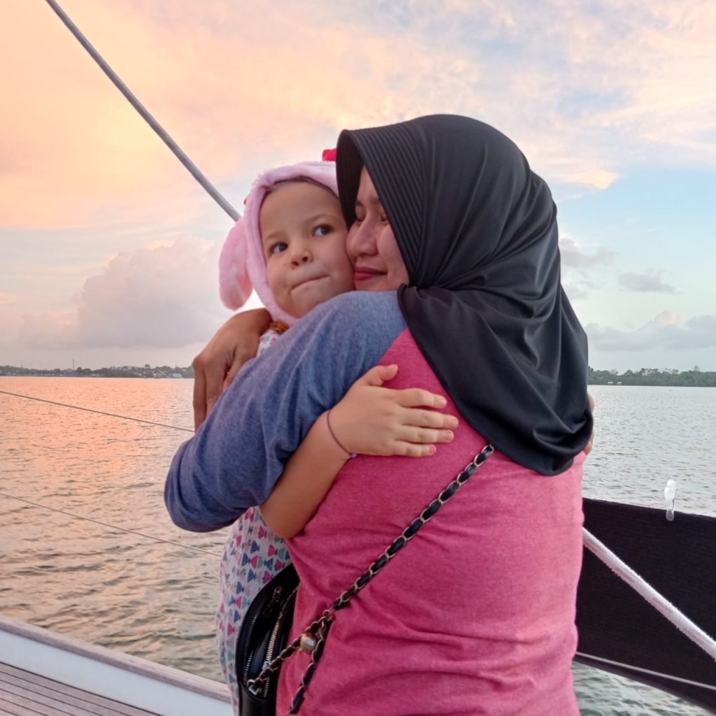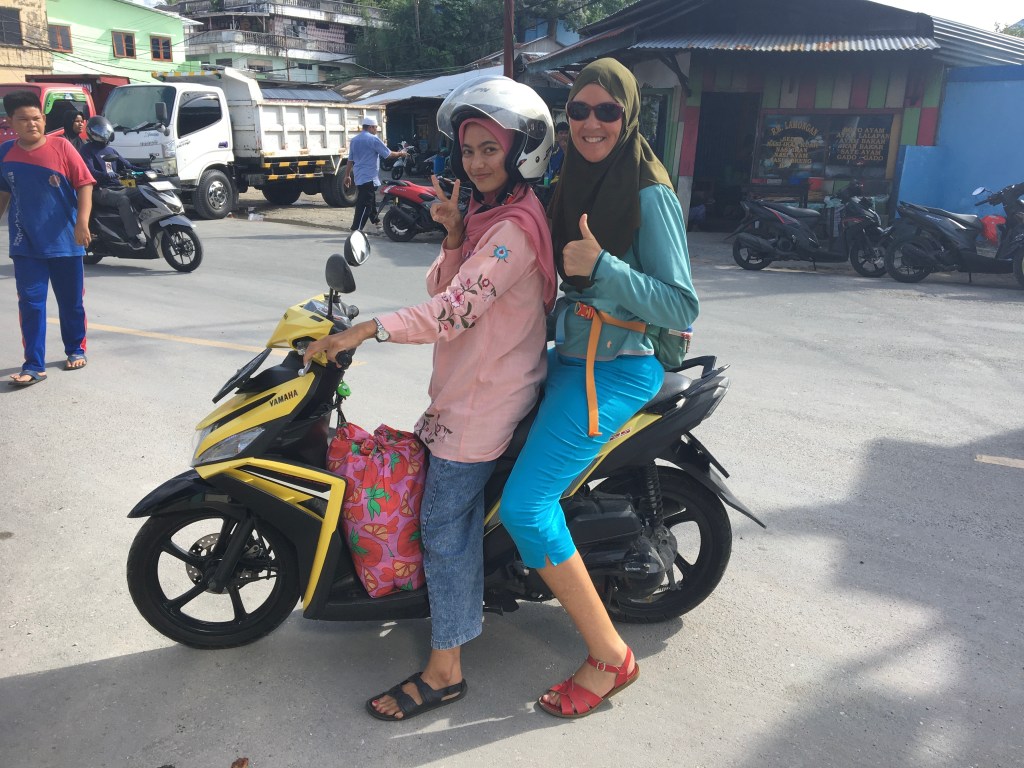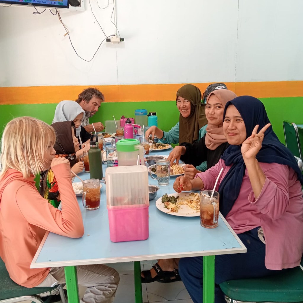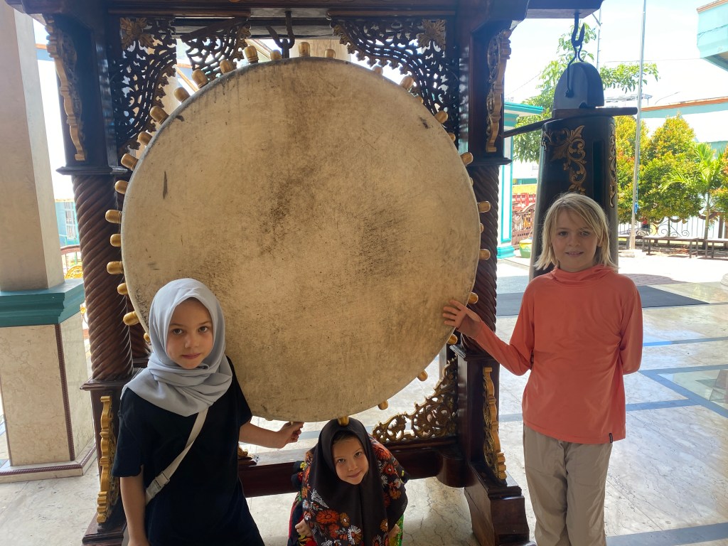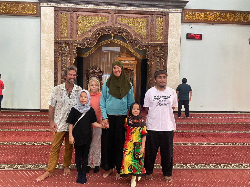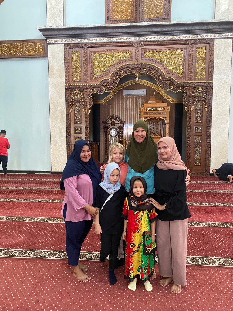 After we cleared in on Wednesday and said goodbye to our agent, we met Dinda in front of her cell phone shop. She bought some chocolate bananas for Jade and Luz, and asked us to sit down on the bench. Jade asked Dinda where she would get a headscarf (hijab) like hers. Dinda replied that she had so many at home, she would bring some for Jade the next day. Jade said, “could you also bring one for Luz and my mom?” I asked Dinda if it would be possible to visit a mosque, as Jade was interested and had never seen a mosque before. Dinda replied, “of course. we will go in the morning.”