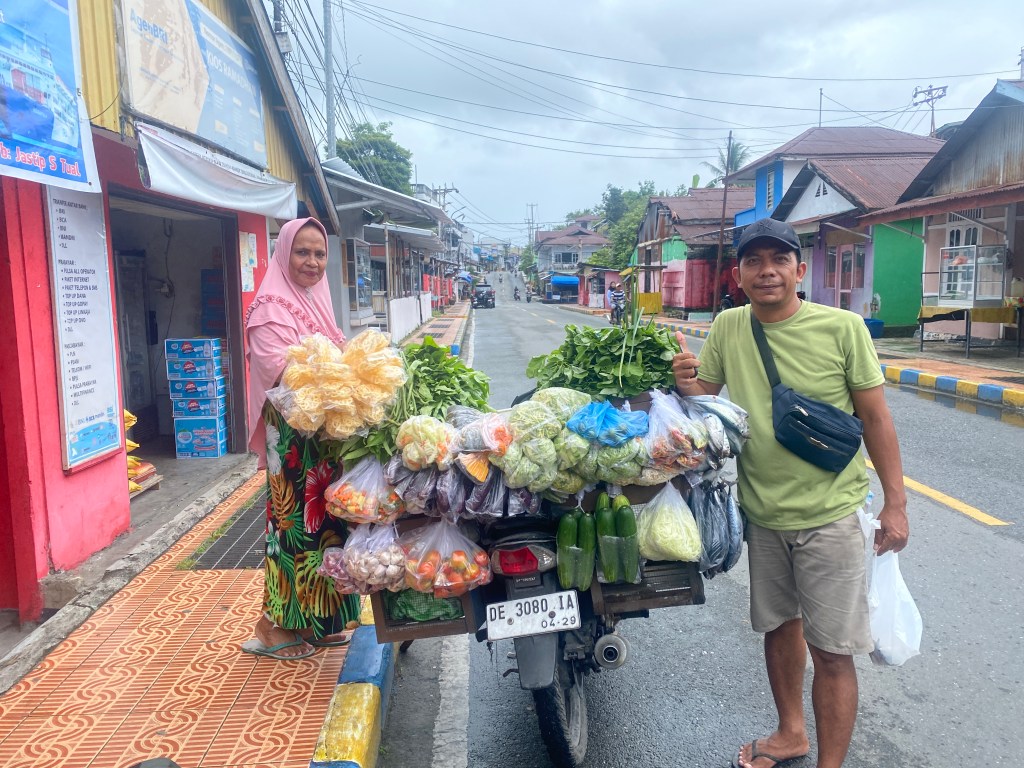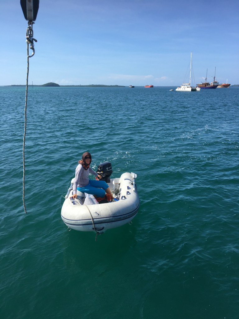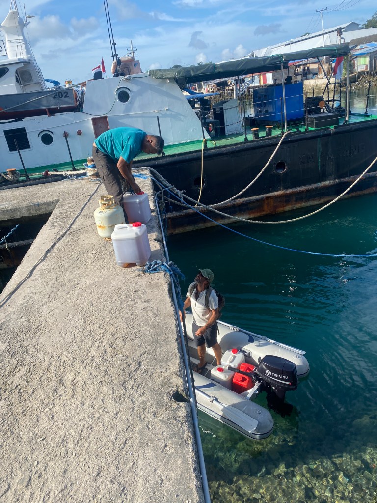 The following day, Friday, Riki and I took the dinghy into town at 7:30 am to meet up with Dinda. She had arranged for mother, their truck and their driver to take our jerry cans to the Pertamina gas station to fill them with DexLite, the middle grade diesel available in Indonesia. We, as foreigners, aren’t allowed to buy it because there is a limited supply. They made 4 trips to the gas station, and Riki made 4 trips out to the boat with the jerry cans to fill up our tanks. Tomu helped Riki transfer the diesel to the tank. I think we finished at 4 or 5 pm. So different than driving the boat up to a fuel dock and filling the tanks in 30 minutes!