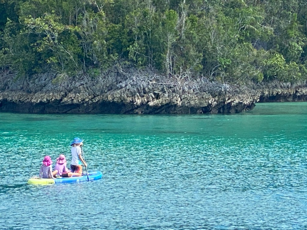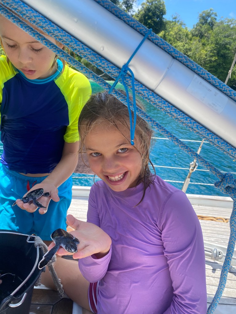 Riki and I went for a snorkel and the kids took the paddle board to the beach. Then two fishermen came up and gave us 7 drinking coconuts and 3 baby turtles that they had caught! We gave them apples and some clothes for their kids. The kids played with the turtles for a little bit, naming them Salty, Sleepy, and Dash. Then once the fishermen left, they set them free.
