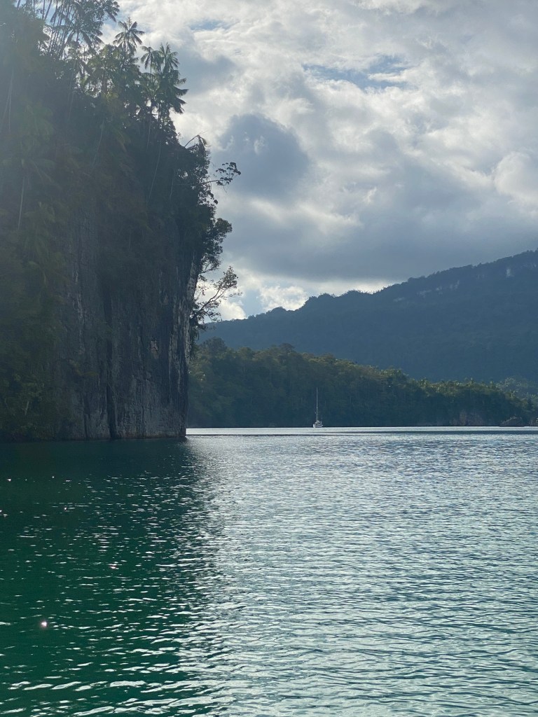 We did an overnight sail to Turtle Cove, Werfa Island because our friends on SV Salty Finch said it was a glorious place. You can only enter at high tide, and it’s a narrow channel through the reef that opens into a blue hole. I didn’t sleep well on passage worrying about that entrance! But it was fine — the lowest depth we saw was 8 meters. Whew!