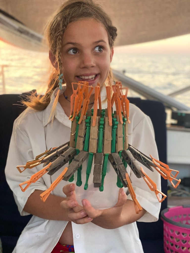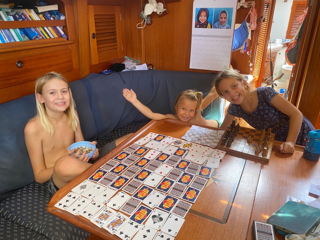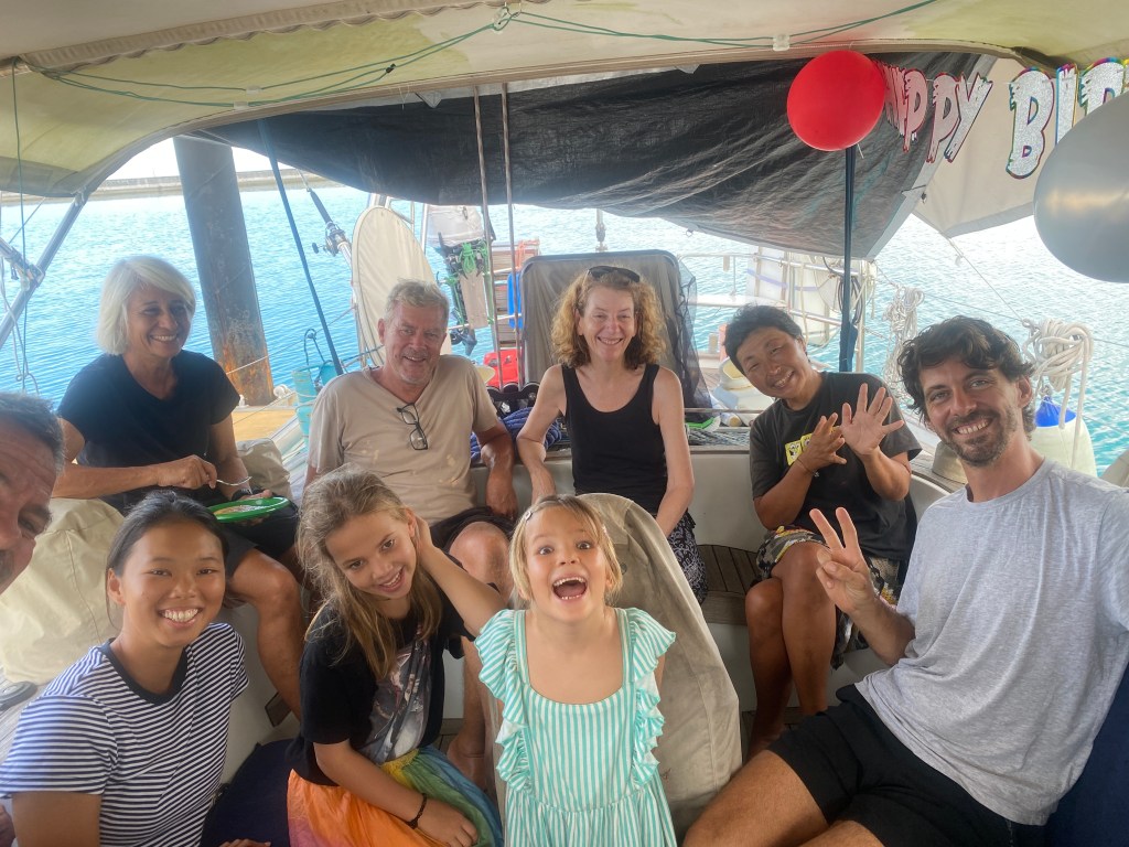 Igna and Kili caught up to us in Wangi Wangi. Igna treated us to a fancy dinner to thank us for helping him to get White Wings III floating again (back when we were in the Togean islands). The next day was Igna’s birthday! We had a pancake party on evi with the other boats on the dock, including Maki from sv turu (whom we met in the Philippines and hadn’t seen since). We also had our second chess tournament, and this time Jade and Luz participated. I prevailed as the victor in this one. 🙂