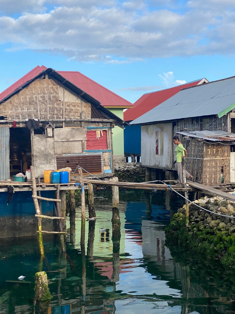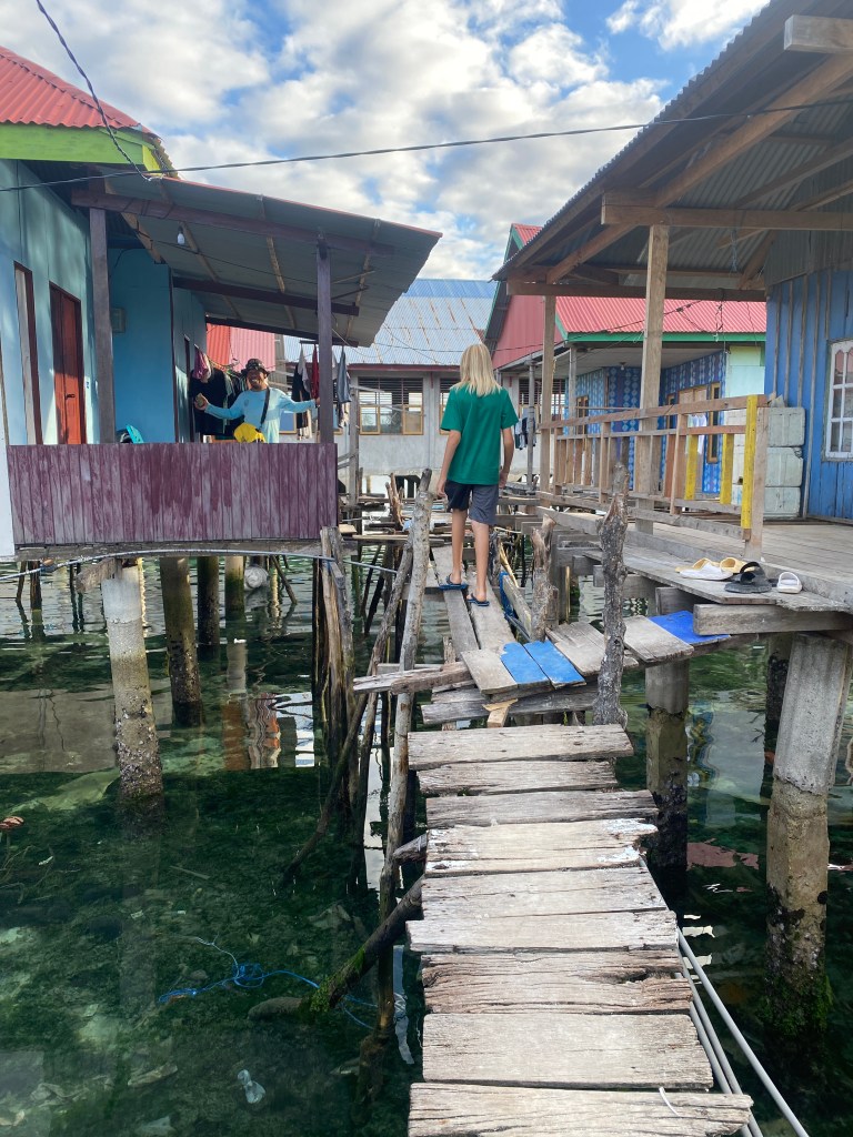 We went for a fantastic snorkel with Albar, a local Bajau (Sea Gypsy). Later, we walked through the Bajau village with Albar and visited his home. We had a group of about 10 kids following us all through the village. The streets were narrow pathways built over the water.