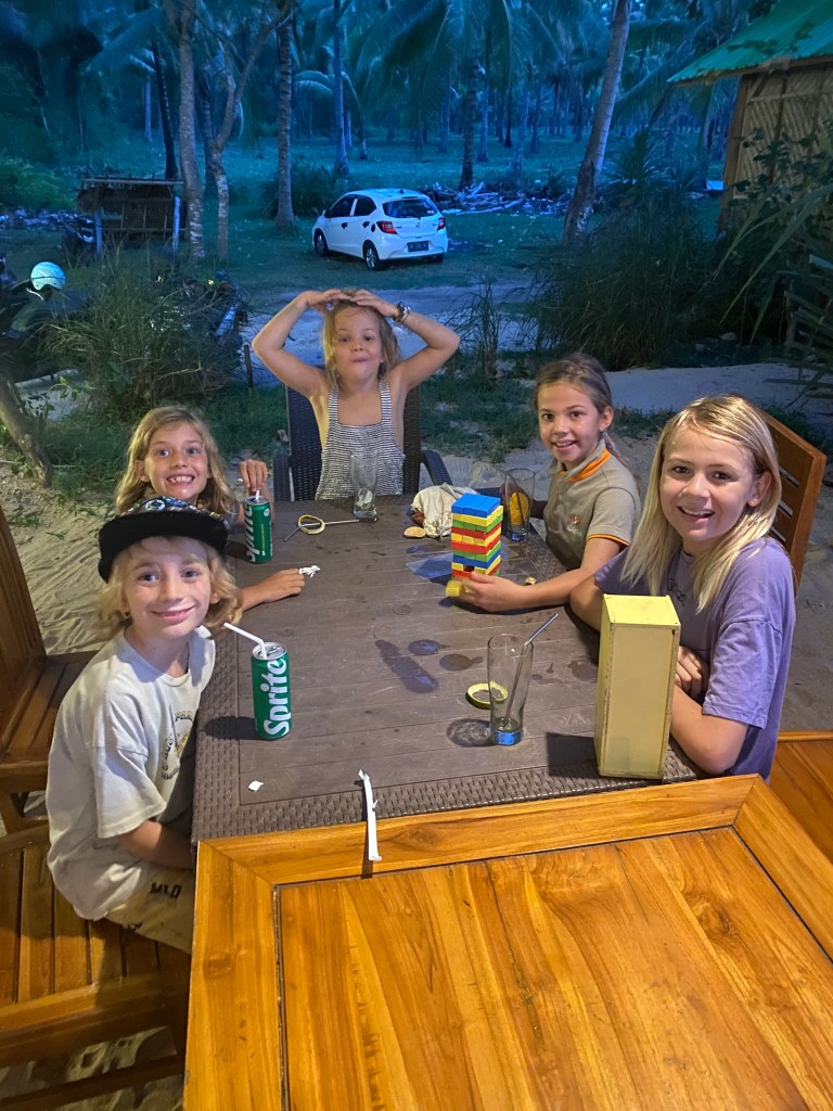 From Moyo we did an overnight to Gili Air, near Lombok. We met up with our friends on SV Tayrona. We’ve been hanging out with them for about 10 days now — our kids are having a blast together.