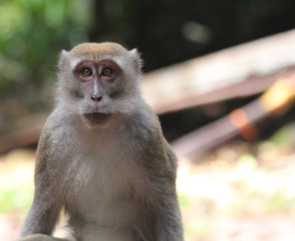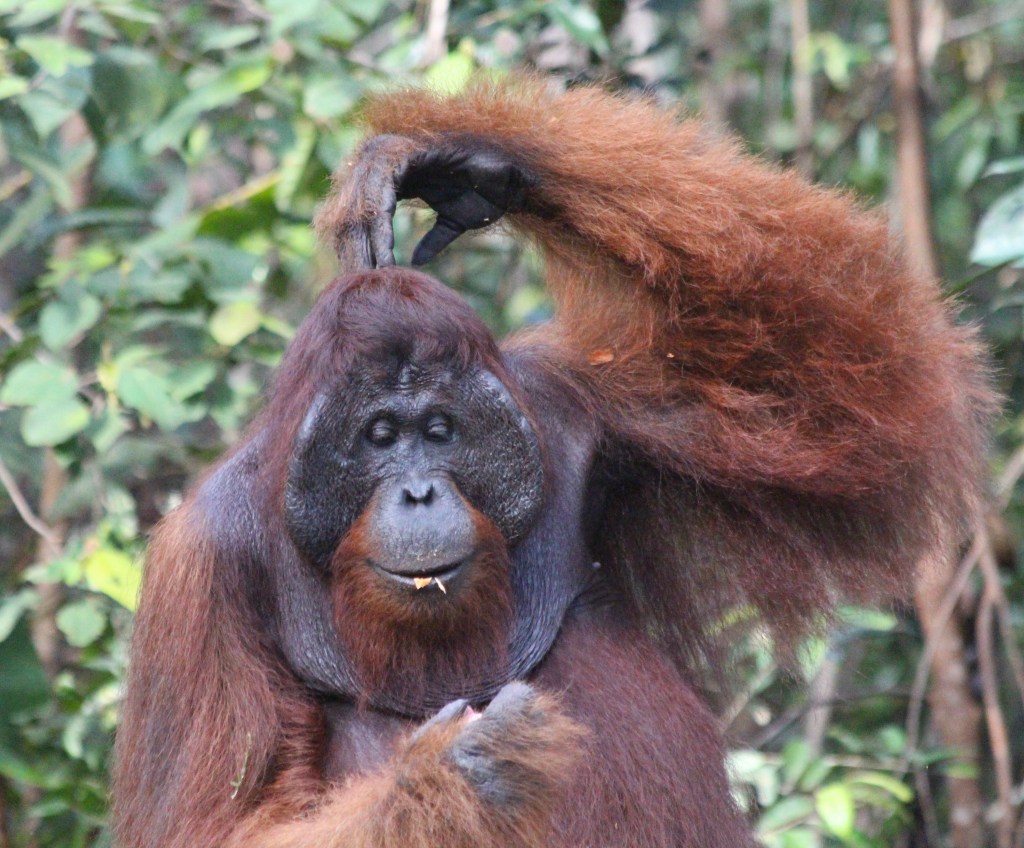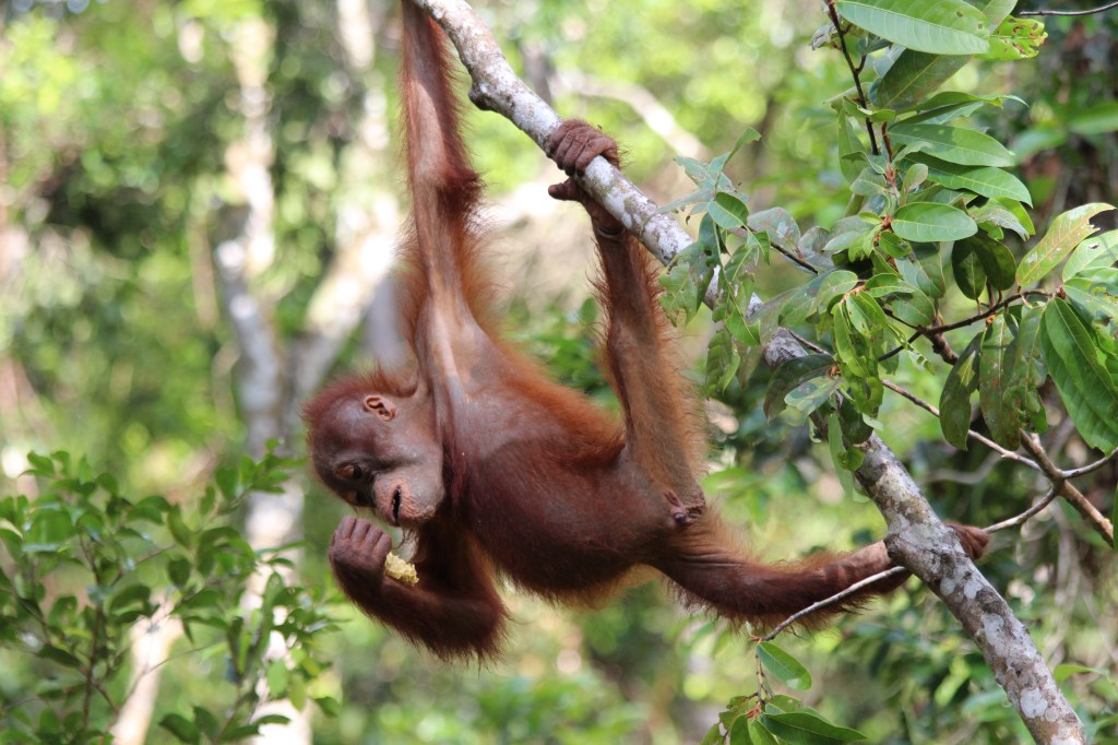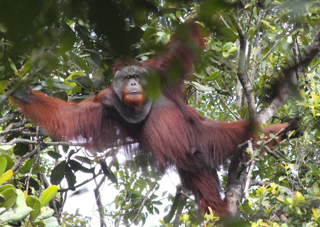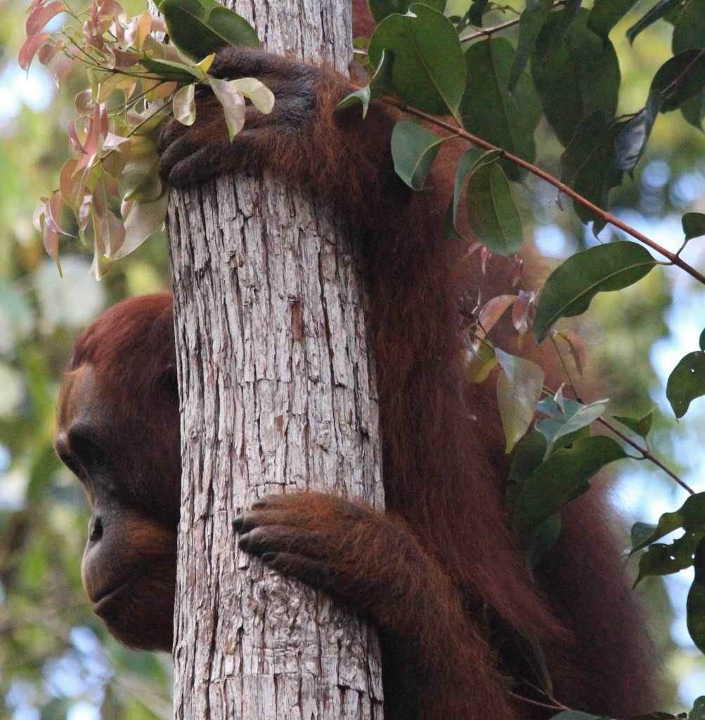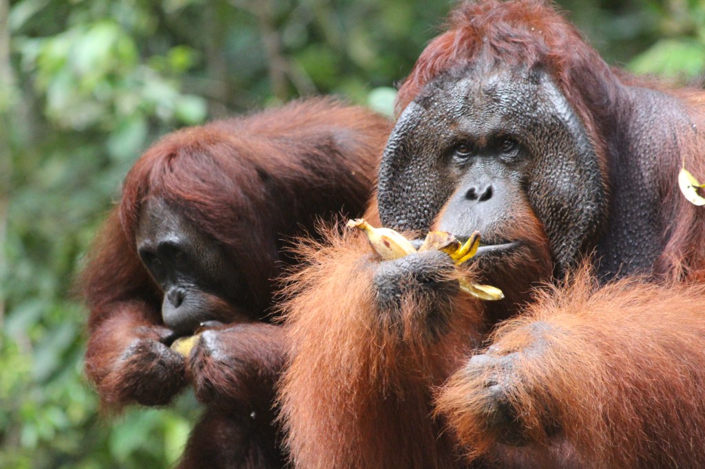 At each of the three feeding stations, the alpha male of the group would come to the platform, sit down, and proceed to eat until all the food was gone. Other orangutans had different strategies: stuffing many bananas in their mouths and retreating to somewhere close to eat them; grabbing some bananas and climbing a nearby tree to eat; staying on the platform away from the alpha male. Orangutans are solitary (males) or semi-solitary (females with offspring). They build a new nest in the trees each night to sleep in. Orangutans don’t jump from tree to tree like the Long-tailed Macaques or Agile Gibbons. Instead, they lean to the side in order to make their slender tree sway back and forth, until they can reach over to the next tree. It seems like they are almost walking through the trees. They are good at climbing trees. Biruté Galdikas, Canadian anthropologist and primatologist, wrote the book Reflections of Eden about her time studying the orangutans at Camp Leakey (the third feeding station). Unfortunately it’s not available as an e-book from my library! These photos were all taken & edited by Riki.