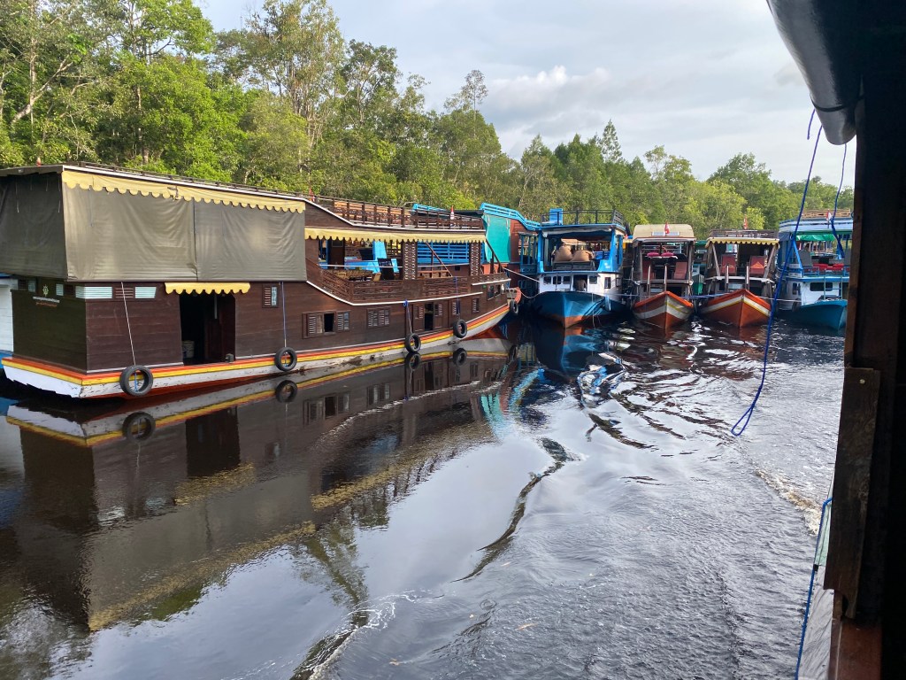 There are three feeding platforms in the National Park. Each has wooden benches set up for tourists to sit and watch the orangutans eating. These orangutans (most of them) were formerly in captivity, often kept as pets. The National Park staff feed them once a day in order to help supplement their nutrition and ease their transition to the wild. The food is especially important when it isn’t fruiting season. Some wild orangutans also come for the food (bananas and sweet potatoes). There were 35 boats on the river with us — most had only 2 guests on them! In the high season, July and August, there are as many as 50 boats.