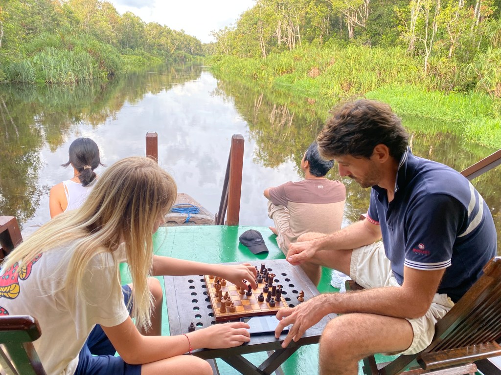 After resting up from our passage, we embarked on a klotok — a local river boat — for a three day and two night tour into Tanjung Puting National Park. The boat was quite comfortable. We slept on mattresses under mosquitos nets at night. We could sit on the bow and look for animals, or go up to the top deck for a closer view of the trees. All of our meals were delicious. The highlight of the trip for the kids was the Coca-Cola (as in that was even better than seeing orangutans!). Here are some pictures.