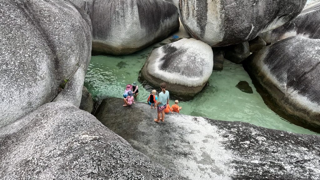 We were ready to stay in one spot and rest for a bit. Belitung has tons of huge granite boulders, all bunched-up together in groups. There were cool caves between and underneath the boulders. We explored them with Eva & Jan, Tonda, Teo & Zita on SV Kagou. Our last morning Tomu took the paddleboard alone to a new bunch of boulders. We later spied him with the binocs atop the highest pinnacle! He made it back safely to the boat. I think it’s good for him to have some adventures on his own, even if the “what ifs” my brain goes through are stressful.