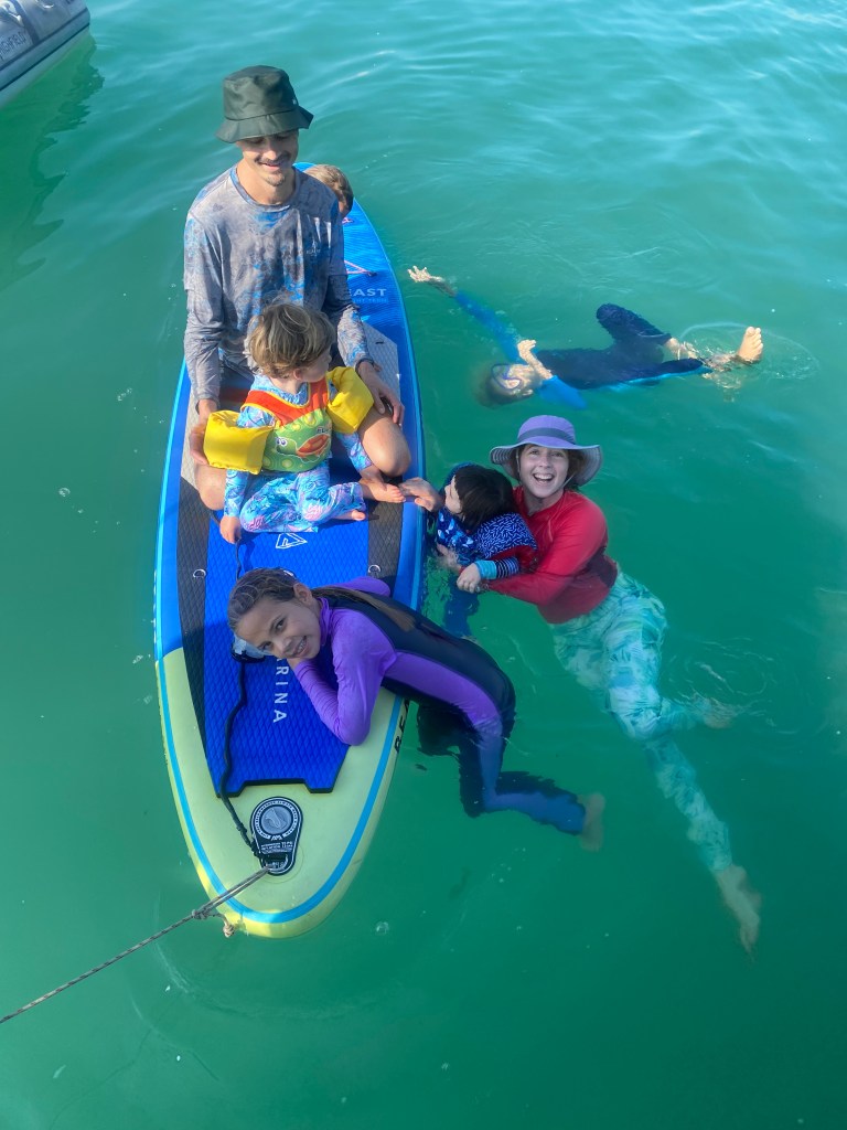 Our visitors have had a few maladies so far: Weston got some string of pearls jellyfish stings, Justine a slight sunburn, Jaspy threw up for about 24 hours, and today Mira is sick. But they are all adapting well to boat life. Jade says, “Justine is a fun adult. And Worty is a fun adult.” Nice to have some of those around. We’ve been playing lots of games in the evenings. We taught Justine Doppelkopf, and she taught us Yoo-haw. We went for our first sail yesterday, about 22 miles, and no one got seasick. 🙂