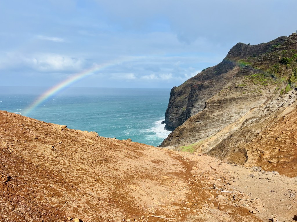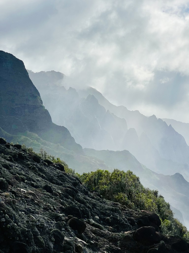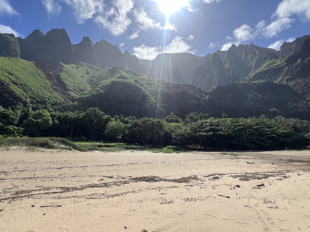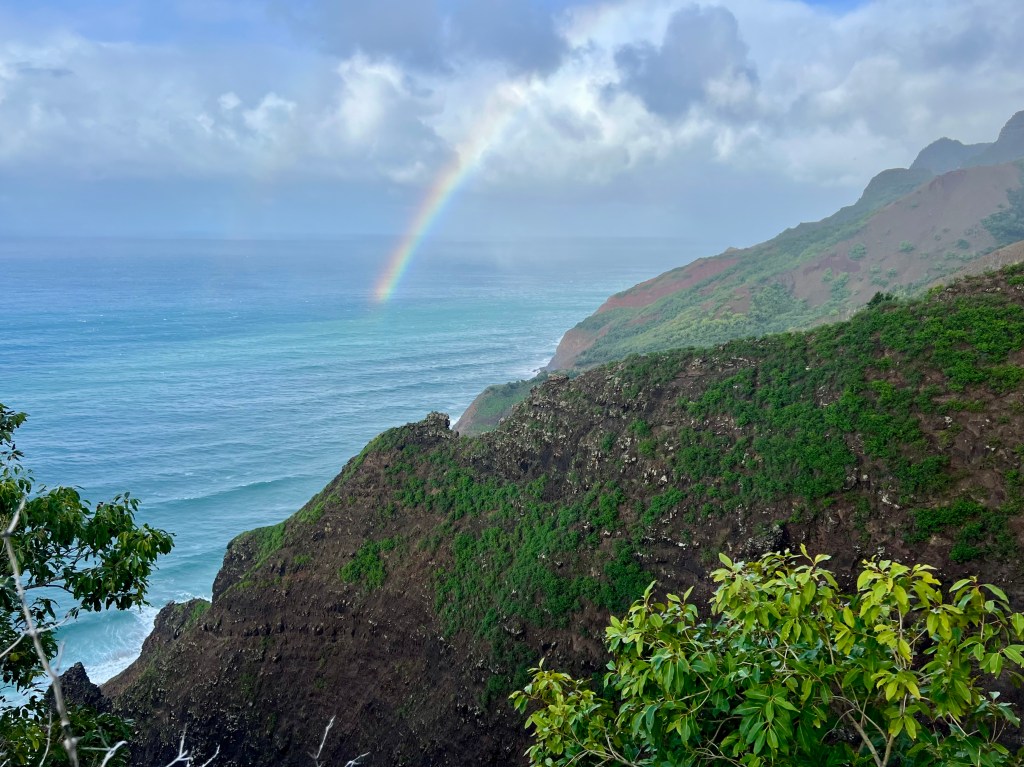 And then, the highlight of the trip was our backpacking trip on the Na’pali Coast Trail to Kalalau Beach. It was an intense 11 miles, as we forded rivers in the rain, climbed up and down steep slopes on slippery mud, and traversed Crawler’s Ledge in strong winds. We arrived just at sunset to Kalalau Beach.