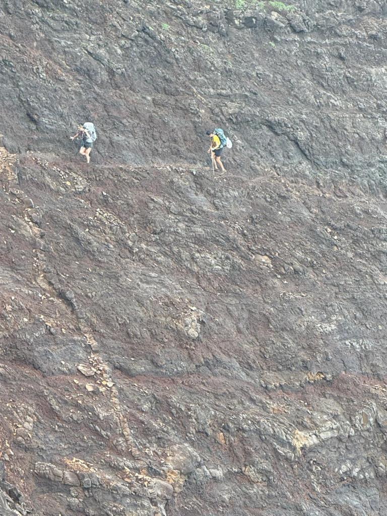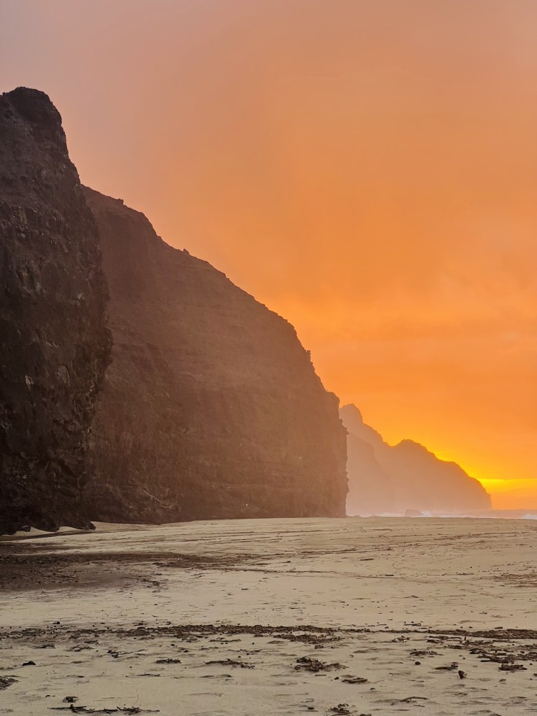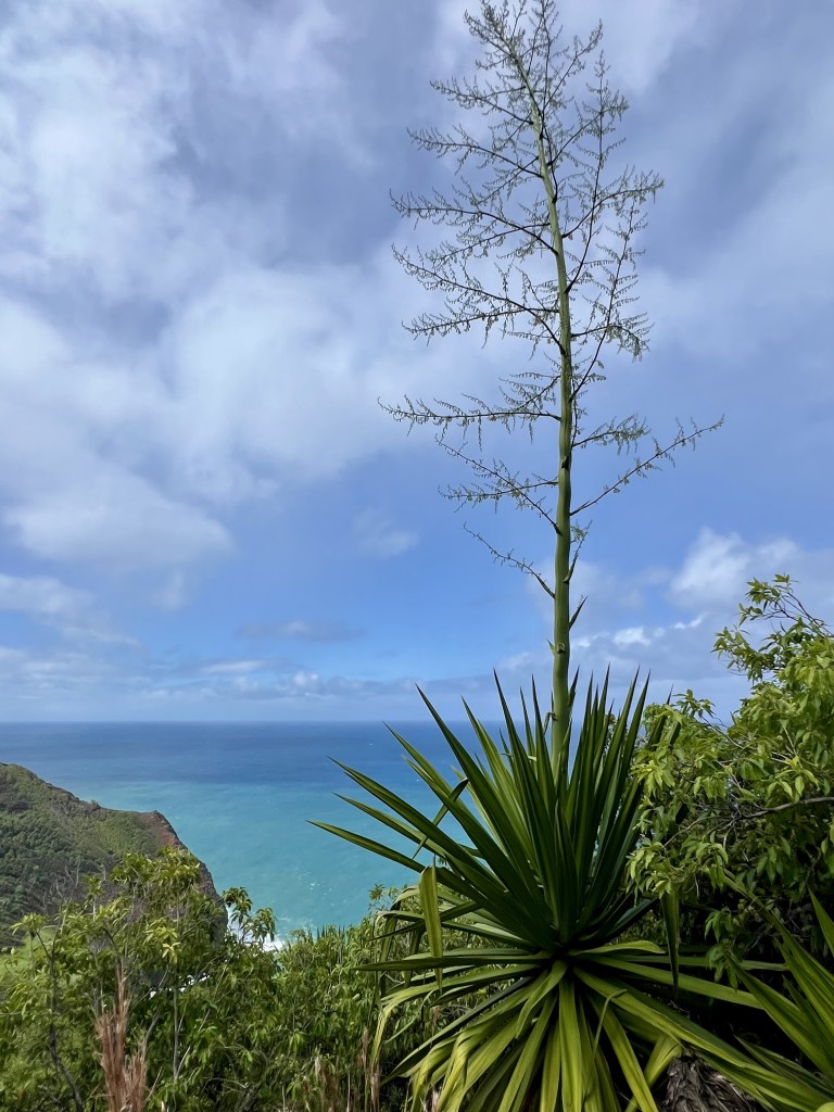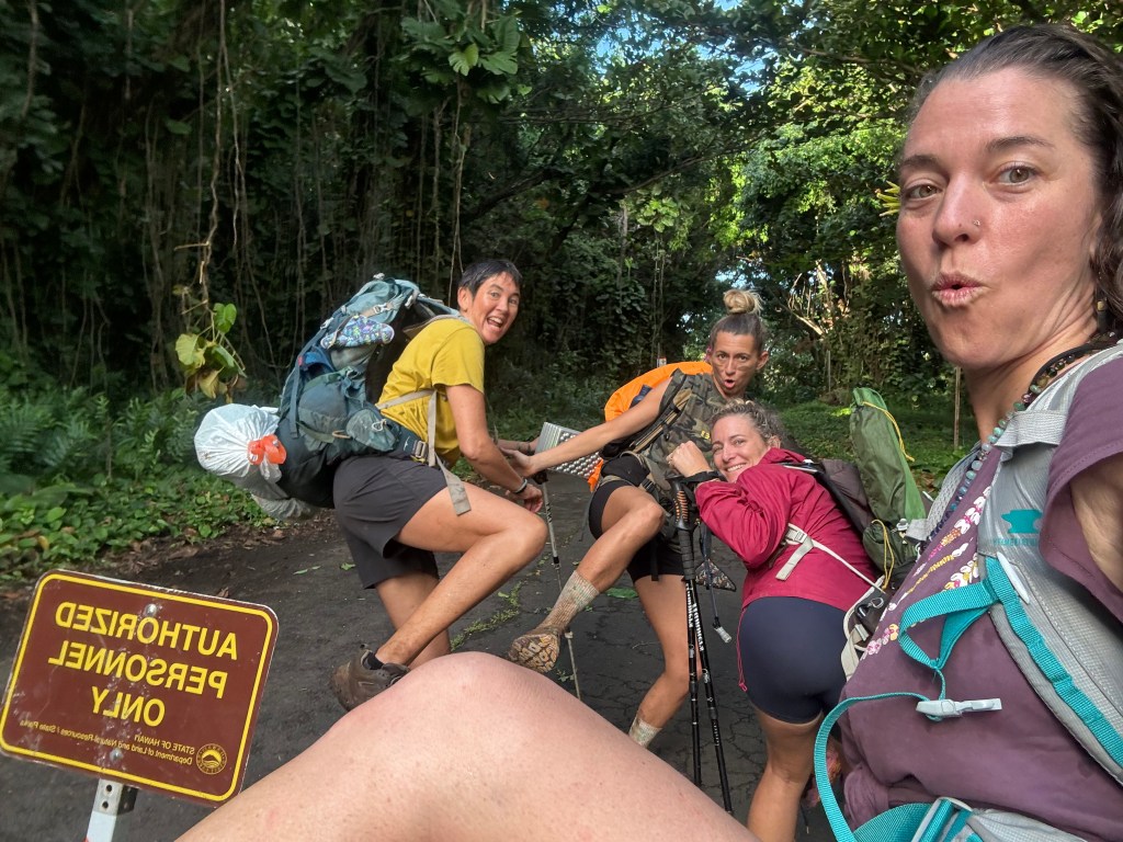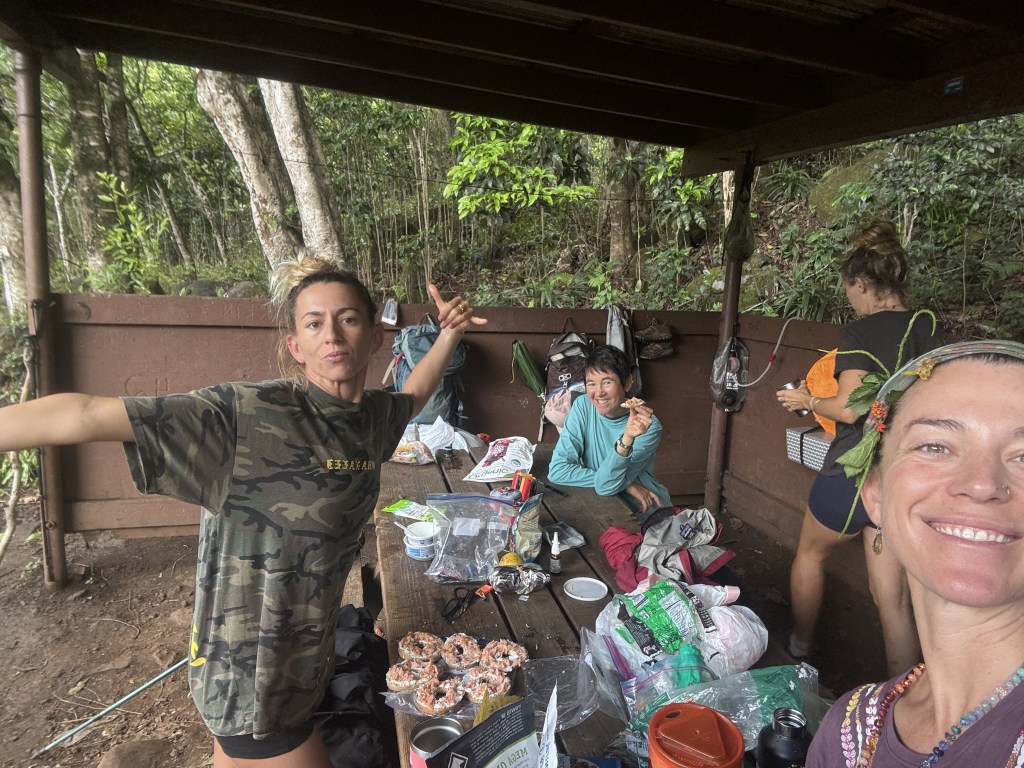 And then, the highlight of the trip was our backpacking trip on the Na’pali Coast Trail to Kalalau Beach. It was an intense 11 miles, as we forded rivers in the rain, climbed up and down steep slopes on slippery mud, and traversed Crawler’s Ledge in strong winds. We arrived just at sunset to Kalalau Beach.
