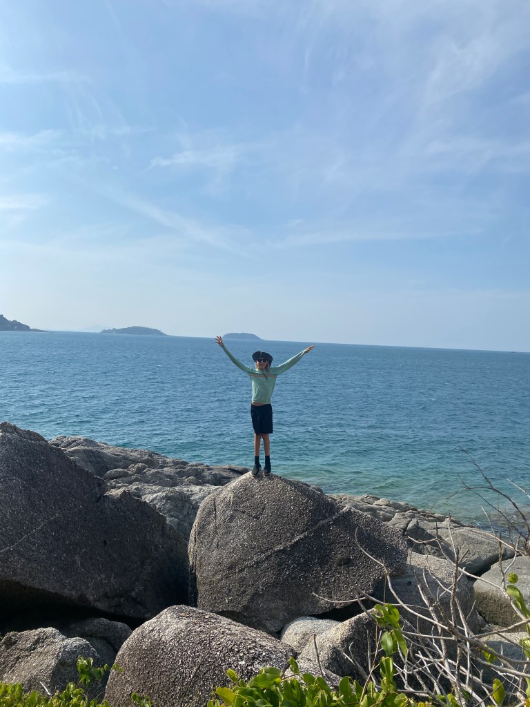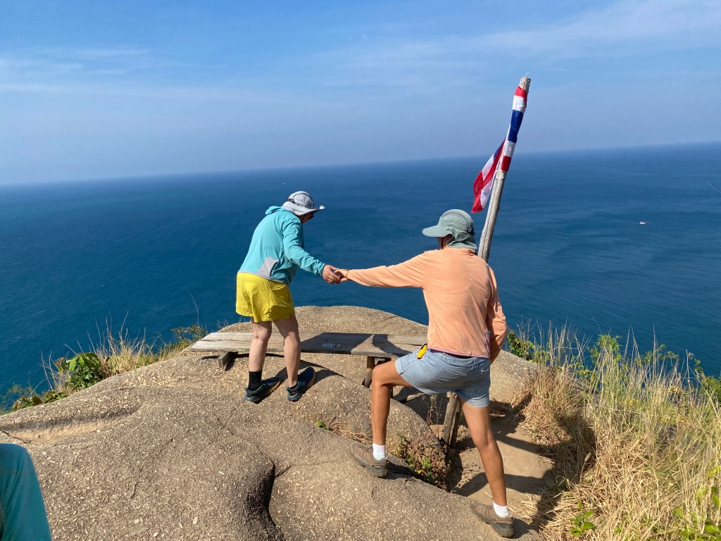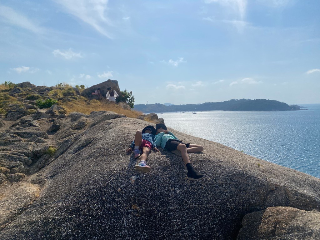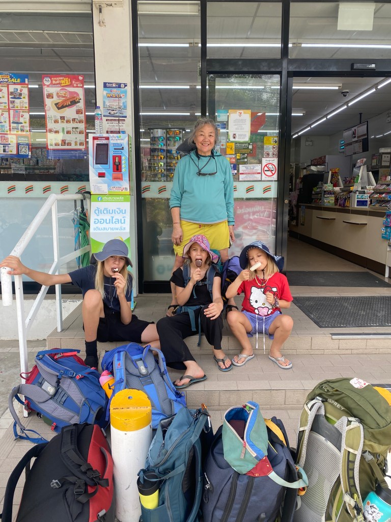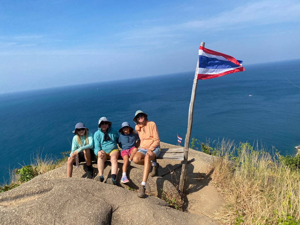 The kids loved Bang Thao beach. Every afternoon they would play on the island with Jeb and Hannah from SV Picasso. They found a natural swing (a thick vine) and tunnels through the rocks, jumped off a tree into the water, swam across the “river” between the island and the main beach, climbed on the rocks, played “cheat”…One day Po Po and I swam across and played with Luz. She was jumping up on all the rocks, posing, and saying, “take a picture of me!” We didn’t have our phones, so I snapped photos with my pretend camera. Then she said, text the photo to the 8 Great (our family text thread). So I pretend texted. Next, “what did they say back?” We were cracking up.