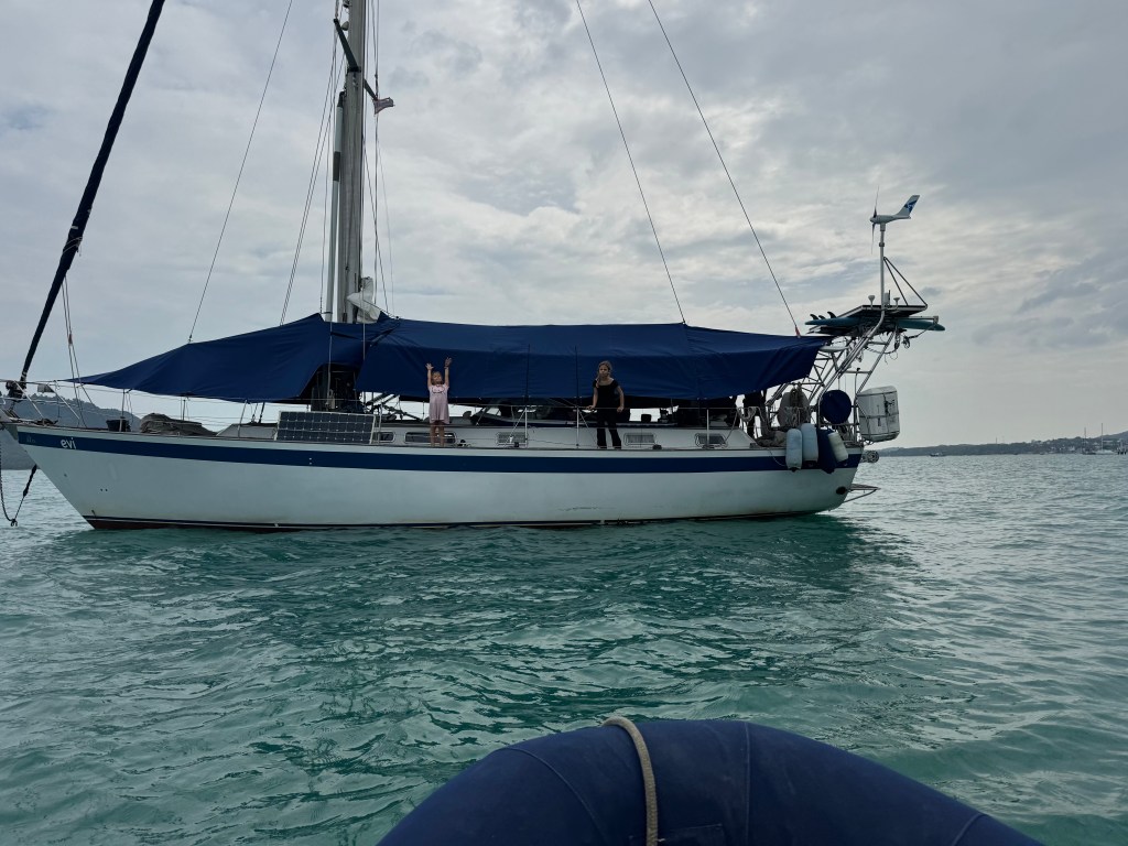 In Bang Thao beach I made a big mistake with the dinghy. I dropped the kids off at the northern end of the beach to play with some other boat kids, then returned to the evi for the anchor. I anchored the dinghy outside the breaking waves further south on the beach, and I assumed it was low tide. Not sure why…we were new to the area, so I didn’t really have a reference. Ma and I went to a little truck to have Thai iced tea and book some accommodations for our trip. About an hour later, Jade came running up. She said frantically, “Mama, the dinghy is in trouble! It was getting smashed in the waves, and the fuel tank flipped over and is floating in saltwater!” Oh no!! We got back to the dinghy, and motored back towards evi. The outboard died partway there, so we rowed the rest of the day. Riki spent the entire next day taking apart the carburetor, emptying the fuel can of the fuel mixed with saltwater, and cleaning the sand out of the dinghy. And the outboard still didn’t start! But the next day he cleaned it again, taking apart one screw that he hadn’t the first time, and it worked. Whew! I learned my lesson — always check what the tide is doing, especially when there are waves breaking on the beach!!