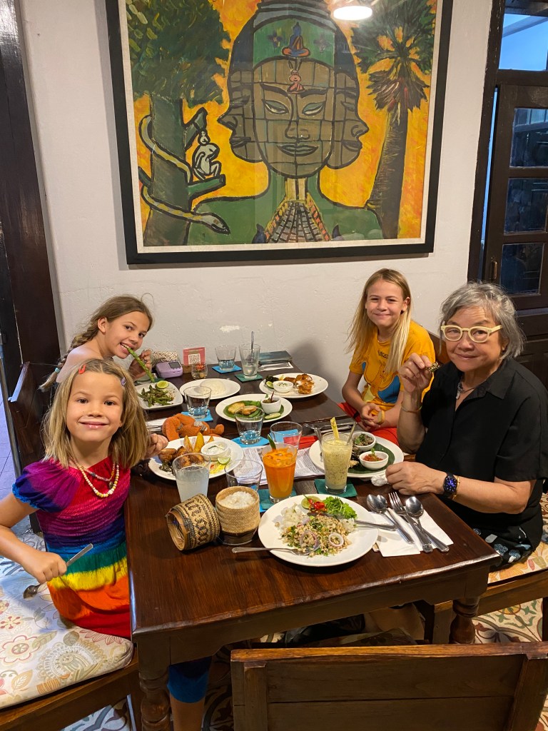 Later that night we ate at Khaiphaen, which is a vocational training restaurant named after the popular Laotian crispy river weed snack. The restaurant trains former street youth to become chefs and servers. Each person’s shirt said Trainee or Trainer on the back. The food was delicious, and the atmosphere fancier than our usual. We ordered the sticky rice, and thought about all the work it takes to grow it!