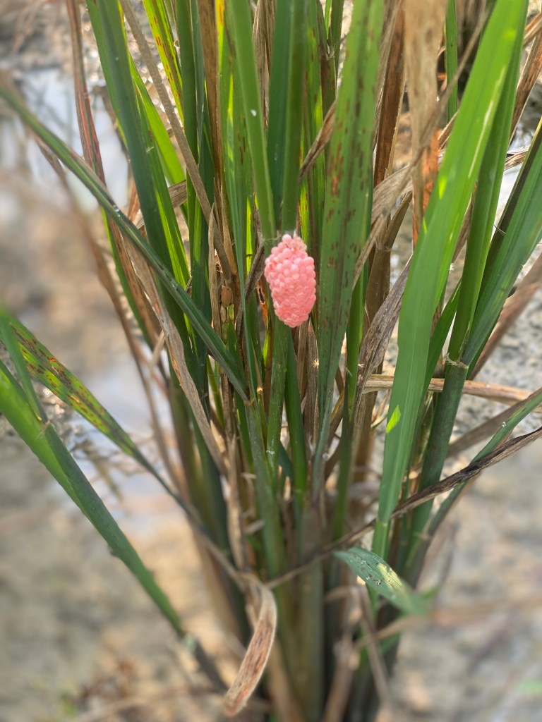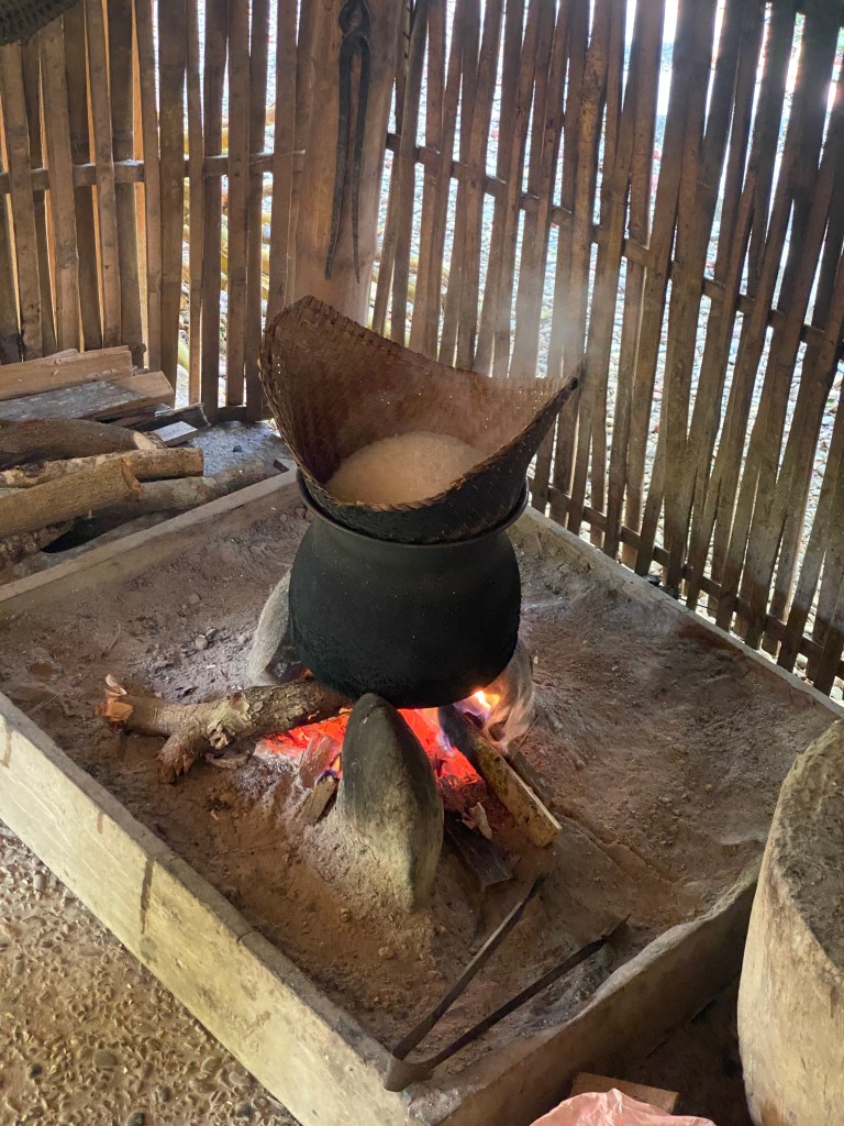 I tried to plow with Luz, but gave up after a few steps. The water buffalo walks quite quickly, the plow is heavy, and the mud is deep! Tomu planting his seedlingsSnail eggs! The rice paddy has to be drained once a month and sit dry for 5 days. Then the snails come to the top and can be killed. Ma harvesting rice. She moved so deftly with that sickle! She only noticed the blood dripping on her shin afterwards.Luz threshing the riceThe kids are modeling the different ways of carrying the rice harvest, according to the three main ethnic groups in Laos. Jade is modeling the Lao way, Luz the Hmong way, and Tomu the Khmu way.Winnowing the rice: separating the lighter husks from the edible graintraditional way of steaming sticky riceThese are all snacks made from rice that we got to eat at the end of the experience.