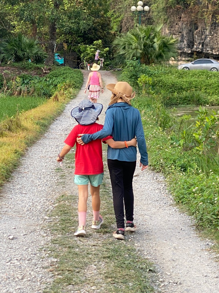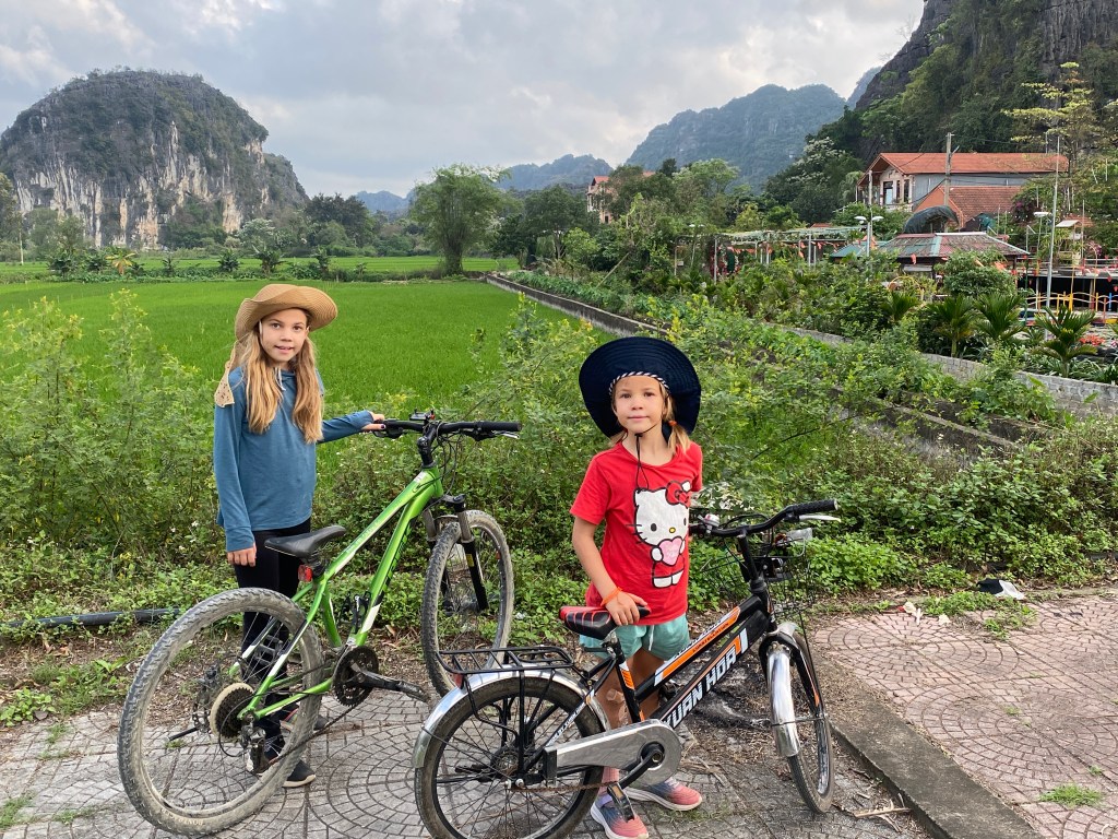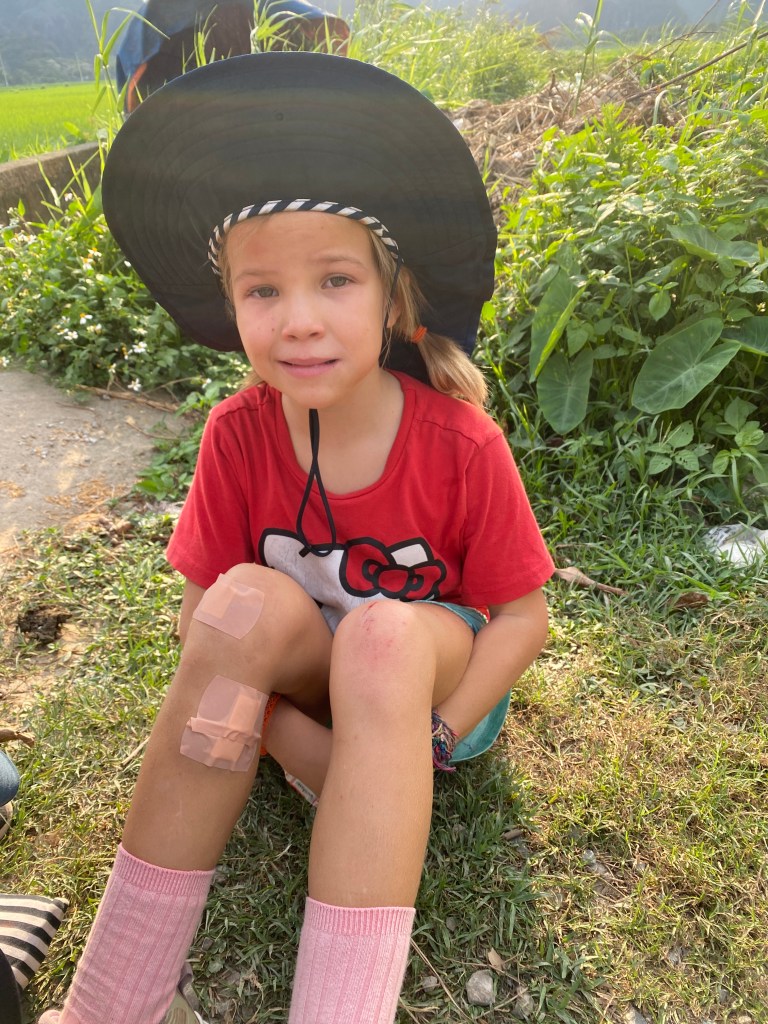 A popular activity in Tam Coc was biking around the rice paddies. We had rented bikes, and set out of town on the side of the narrow road. I rode first, then Luz, Jade, Ma, and finally Tomu. I saw a road going between the paddies, and started along it to take some pictures. It turned out to be a gravel road, and Luz had a big fall. She was a really tough kid, and got back on the proverbial horse. Whoops Mama, not a good plan to take the gravel road!